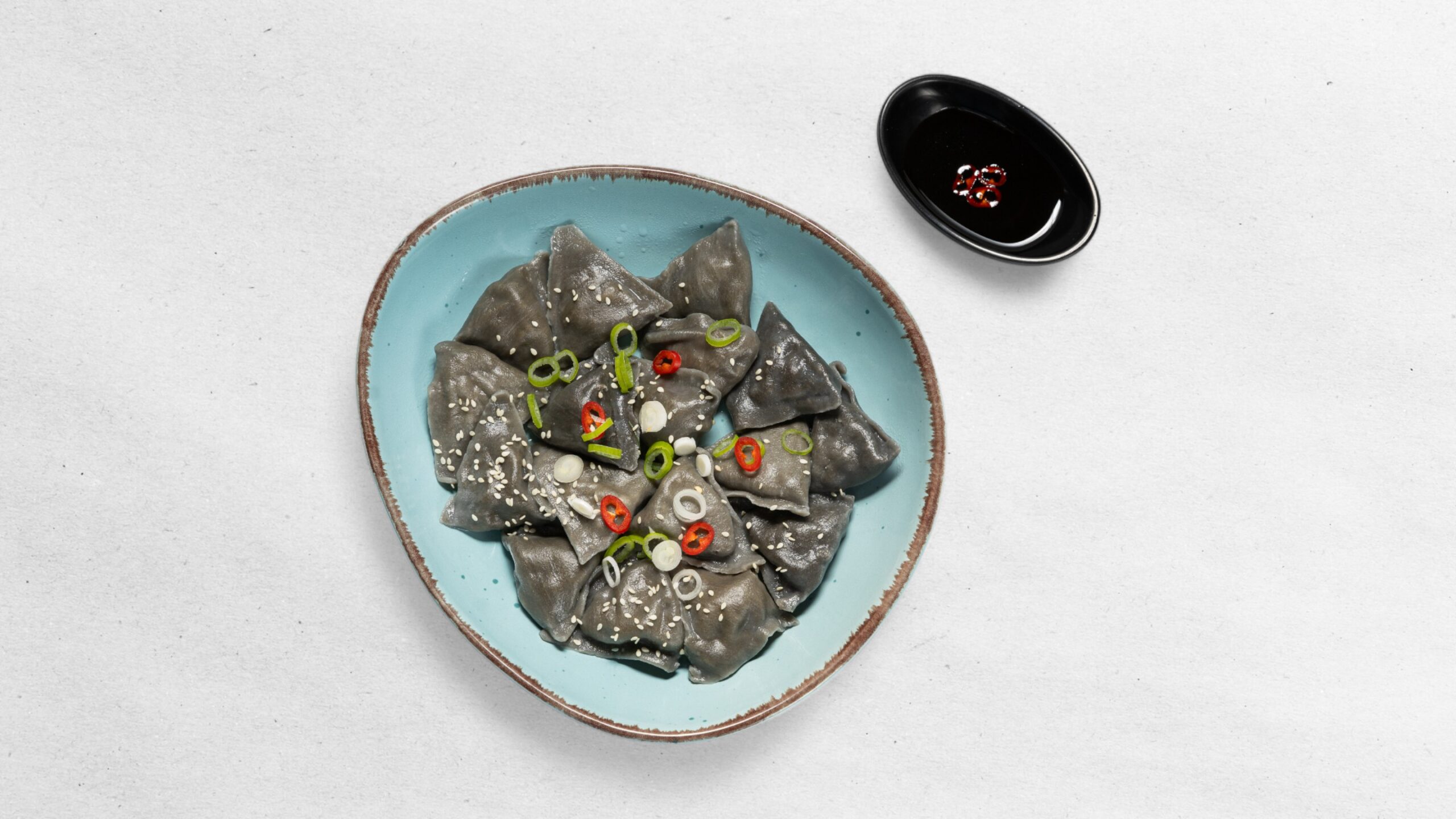 Taštičky plněné krevetami a kuřecím masem, petržel, ústřičná omáčka, zdobené sezamem, jarní cibulkou, chilli a podávané se sójovou omáčkou, cca 250 g